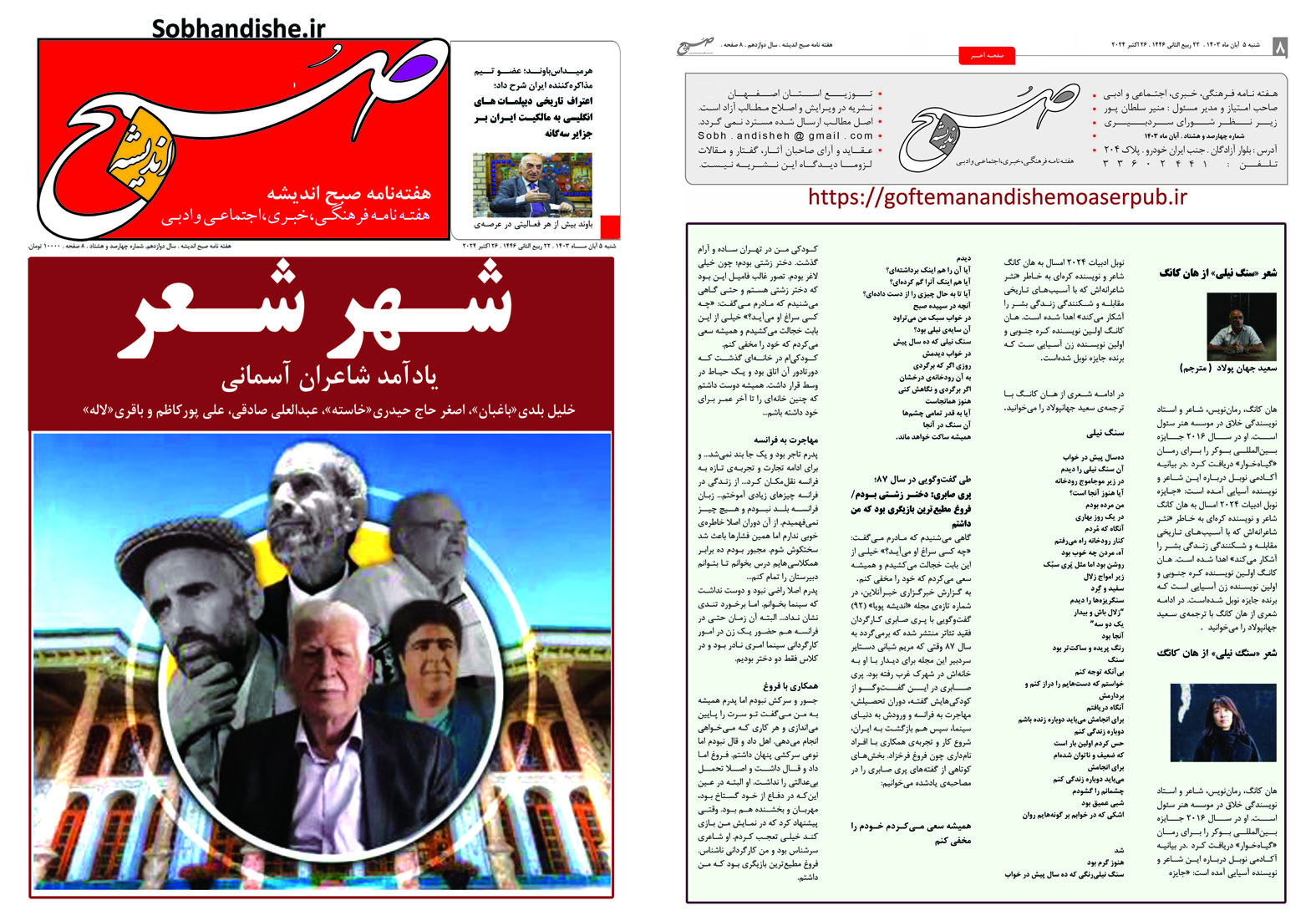 هفته نامه صبح اندیشه شماره 508تاریخ 3 خرداد1404 شهرام شاهرختاش،شاعر متاسف ایام/بازگشت باشکوه انجمن ادبی باران