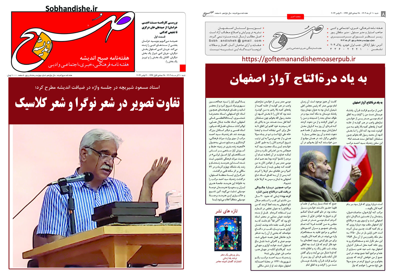 هفته نامه صبح اندیشه شماره 502 تاریخ 23 فروردین 1404 انتشارات گفتمان اندیشه معاصر.پیشگامان سبک نو خراسانی با نگاهی به شعر دکتر شفیعی کدکنی